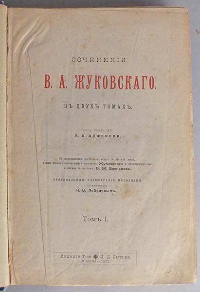 Под редакцией А.Д.Алферова. Издание иллюстрировано многими собственными рисунками Жуковского и др. его современников. Оригинальные иллюстрации исполнены академиком К. В. Лебедевым. НА страницах и титульном листе имеются временные пятна, титульный лист с замятостями. Блок расшатан. В коленкоровом издательском художественно-оформленном переплете с временными потертостями. Корешок с тиснением орнамента и названия золотом. По переплету имеются временные пятна.
