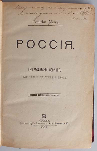 На титульном листе интересная дарственная владельческая надпись, датированная 1900 годом: "Моему милому маленькому племяннику... от тети Кати Дудиной. 1900 год". Шестое дополненное издание. Очерки по географии России, изложенные в художественно-литературной форме. В полукожаном владельческом заказном переплете времени издания. По бинтовому корешку тиснение названия золотом. Небольшое повреждение в верхней части корешка.