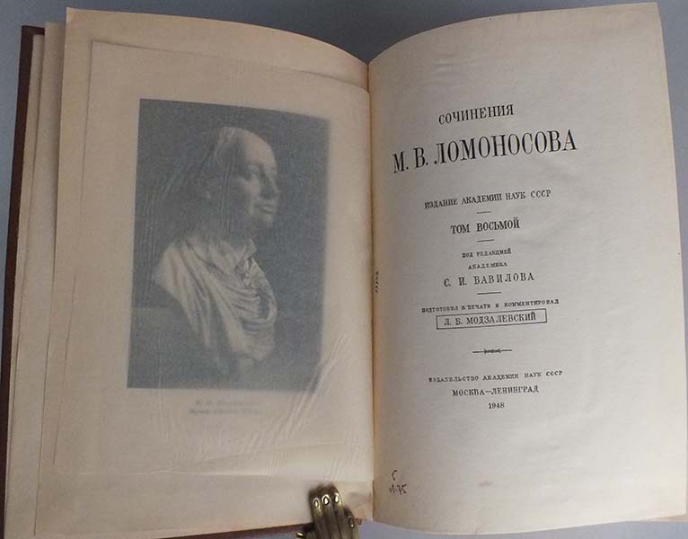 Под редакцией академика С.И. Вавилова. С портретом Ломоносова. Во владельческом коленкоровом переплете с тиснением по верхней крышке и корешку названия золотом.