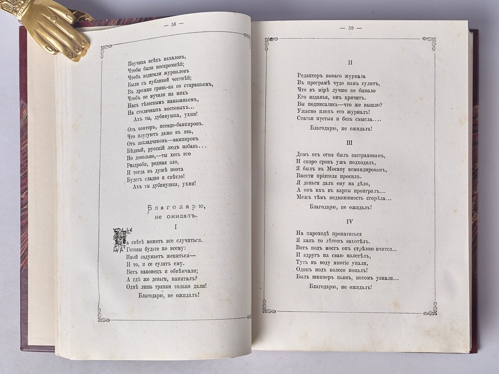 Сборник юмористических, сатирических и комических стихотворений, куплетов, опер, опереток, шансонеток и песен, исполняемых на столичных и провинциальных сценах известными русскими и и ностранными артистами и артистками. Каждая страница текста - в орнаментальной рамке. Некоторые страницы имеют временные пятна. На форзаце и титульном листе шамп-экслибрис личной библиотеки Евгения Петросяна. В полукожаном владельческом переплете. По корешку тиснение названия золотом. Кожаные уголки. Крышки оклеены мраморной бумагой.