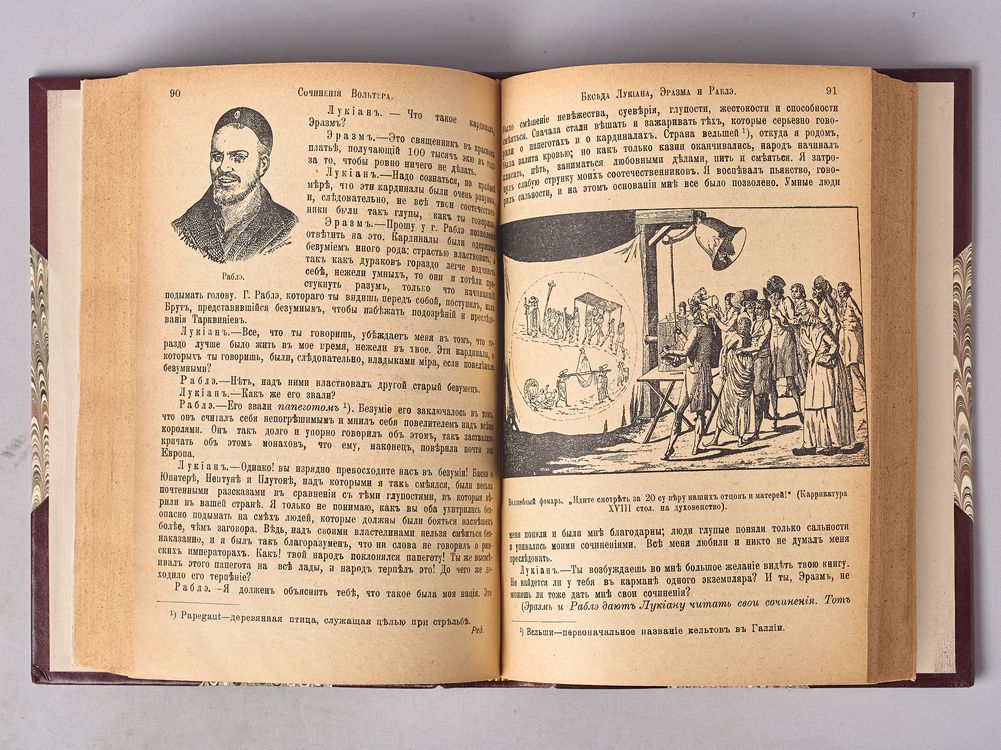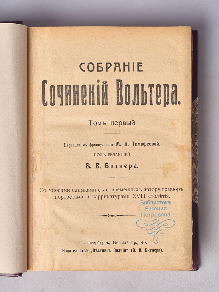 Перевод с французского М.Н. Тимофеевой, под редакцией В.В. Битнера. Со многими снимками с современных автору гравюр, портретами и каррикатурами XVIII столетия. На форзаце и титульном листе владельческий штамп-экслибрис. В полукожаном владельческом переплете. Бинтовой корешок с тиснением названия и орнамента золотом. Кожаные уголки, крышки оклеены мраморной бумагой.