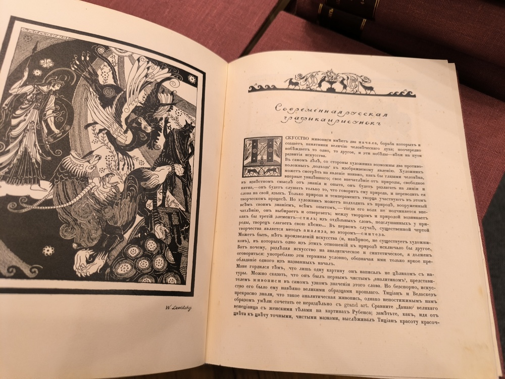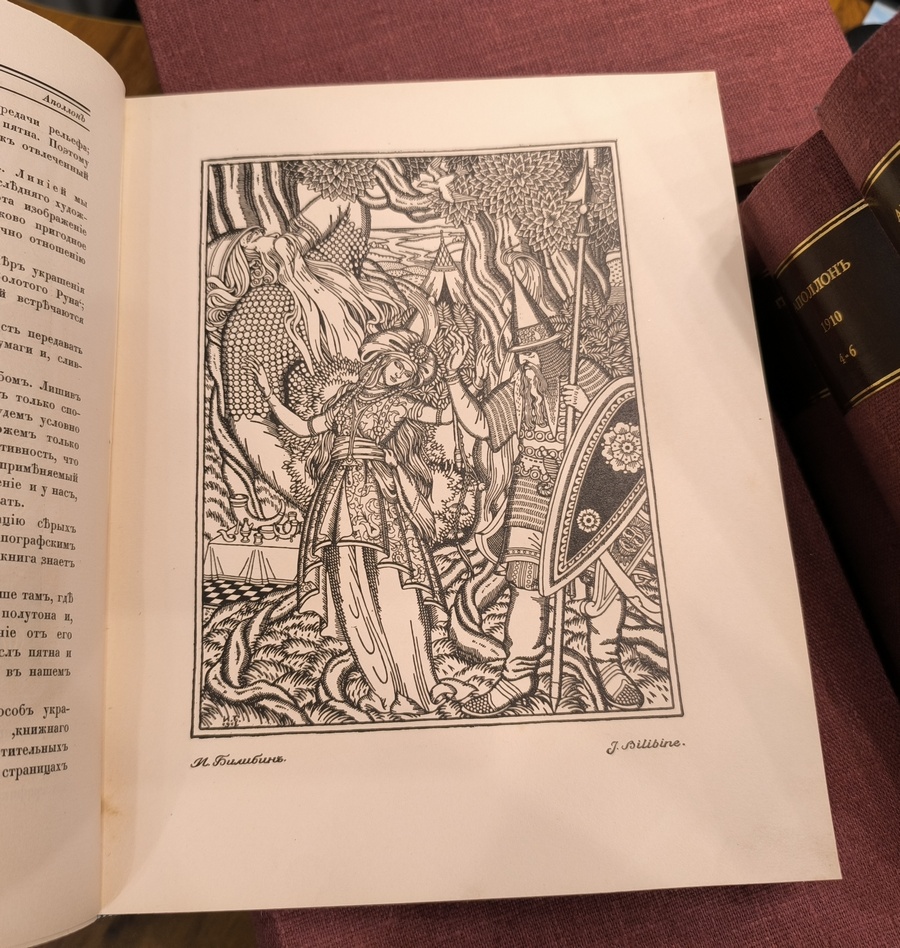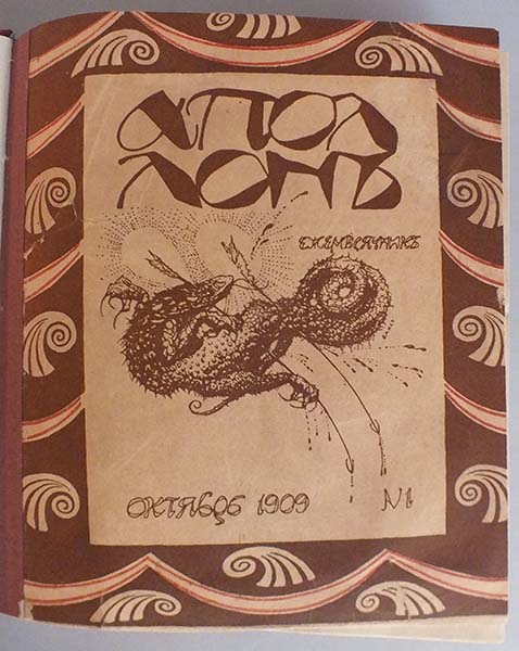 Полный комплект с момента основания знакового журнала (1909 год) по 1917 год. Многочисленные иллюстрации на отдельных листах, в тексте; графические и орнаментальные заставки - полный комплект. Титульные листы работы Л. Бакста, В. Левитского, Е. Нарбута. В двадцати трех владельческих заказных переплетах, затянутых тканью. С сохранением издательских бумажных обложек работы Добужинского (отсутствуют четыре обложки). По корешкам наклейка из кожи с тиснение названия и номеров. Редкость!