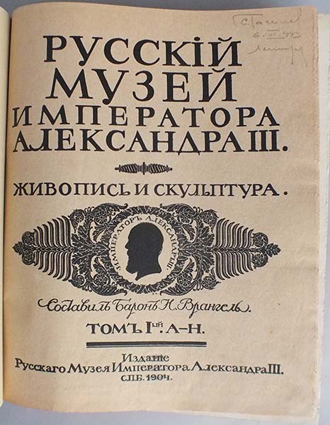 С многочисленными иллюстрациями в тексте и на отдельных листах. Два тома в заказном цельнокожаном владельческом переплете с сохранением внутри печатных издательских обложек. Бинтовой корешок с тиснением названия золотом. По верхней крышке тиснение названия в орнаментальной рамке. Форзацы оклеены бумагой "павлиний глаз". Тройной узорчатый обрез. Один из первых иллюстрированных каталогов Русского Музея, в котором в полной мере отражена история его создания.