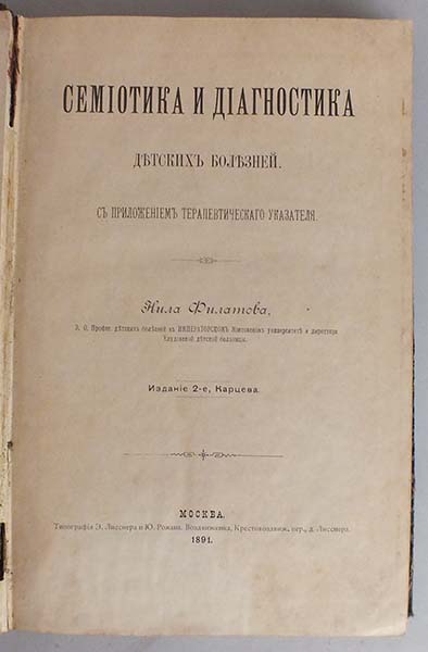 С приложением терапевтического указателя. Издание 2-ое, Карцева. В полукожаном владельческом переплете времени издания. Повреждение по корешку, отсутствует фрагмент в верхней части корешка. Крышки оклеены мраморной бумагой.