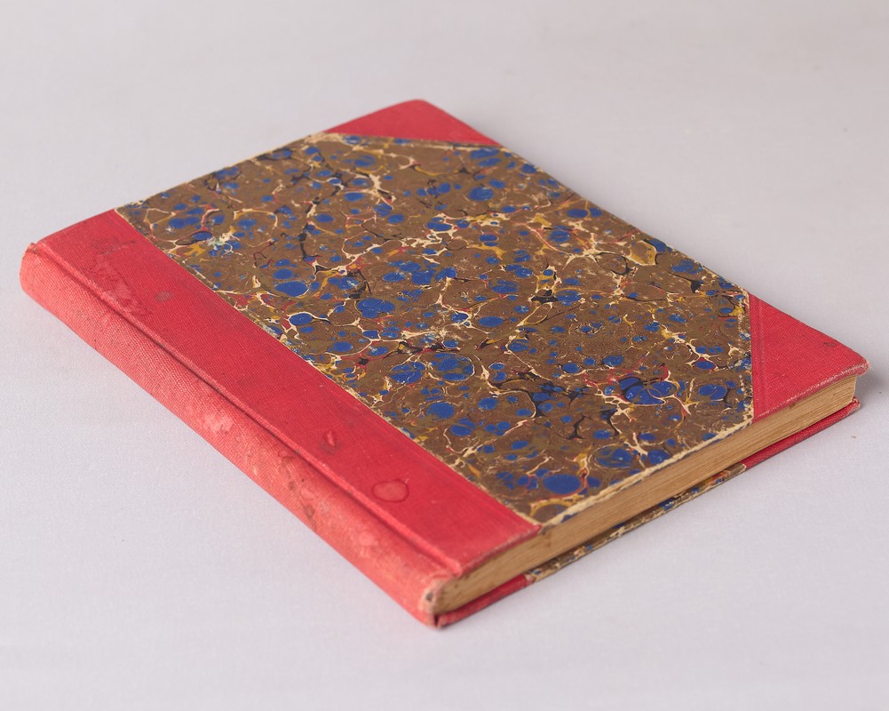 В составном переплете времени издания. Коленкоровый корешок и коленкоровые уголки. Крышки оклеены мраморной бумагой Имеются незначительные временные пятна. На форзаце владельческий росчерк. Раскладвающаяся карта из данного издания заключена в багет, имеет небольшую профессиональную реставрацию по местам сгибов.