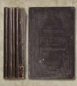 На страницах имеются временные пятна. В пяти тиснёных издательских коленкоровых переплётах с потертостями, небольшими повреждениями по корешкам. Корешок книги "Нового Завет" - имеет более сильное повреждение.