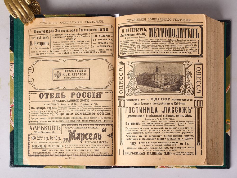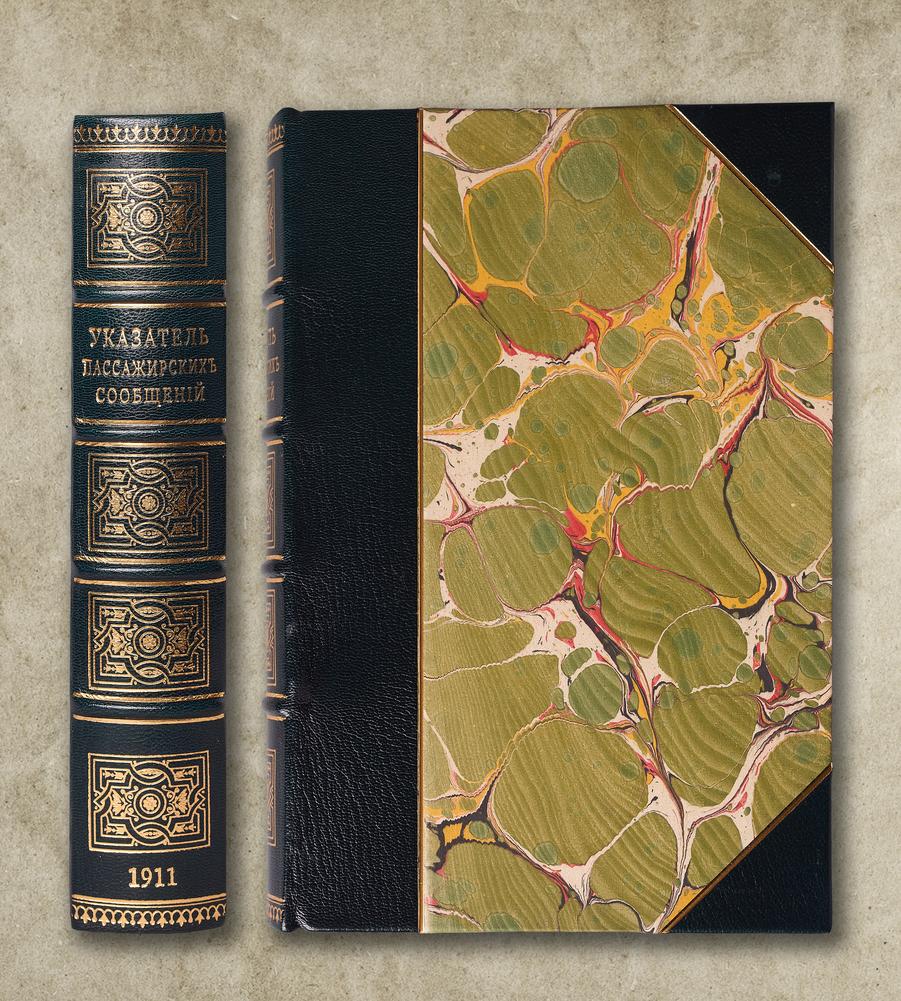 Издание второе. Печатано по распоряжению Министерства путей сообщения. Многочисленная справочная информация, расписания, стоимость билетов, 5 карт, схемы внутри. Отсутствуют две большие карты на отдельном листе. В полукожаном заказном владельческом переплете. бинтовой корешок с тиснением названия и орнамента золотом. Кожаные уголки. Крышки оклеены мраморной бумагой.