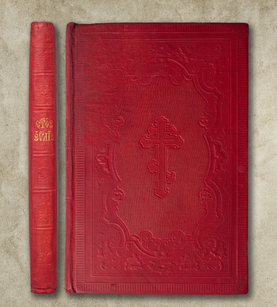 В коленкоровом издательском переплете (профессионально отреставрированном). На верхней крышке тиснение православного креста в орнаментальной рамке.