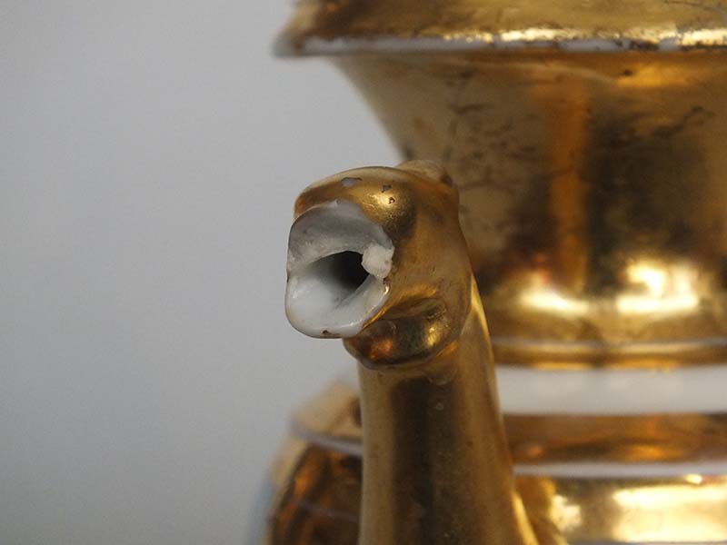 Завод Сафронова. Марка синяя подглазурная. 1810-1820 гг. Фарфор, живопись, золочение. Значительные потертости позолоты. Скол по носику. Профессиональная реставрация ручки.Редкость.