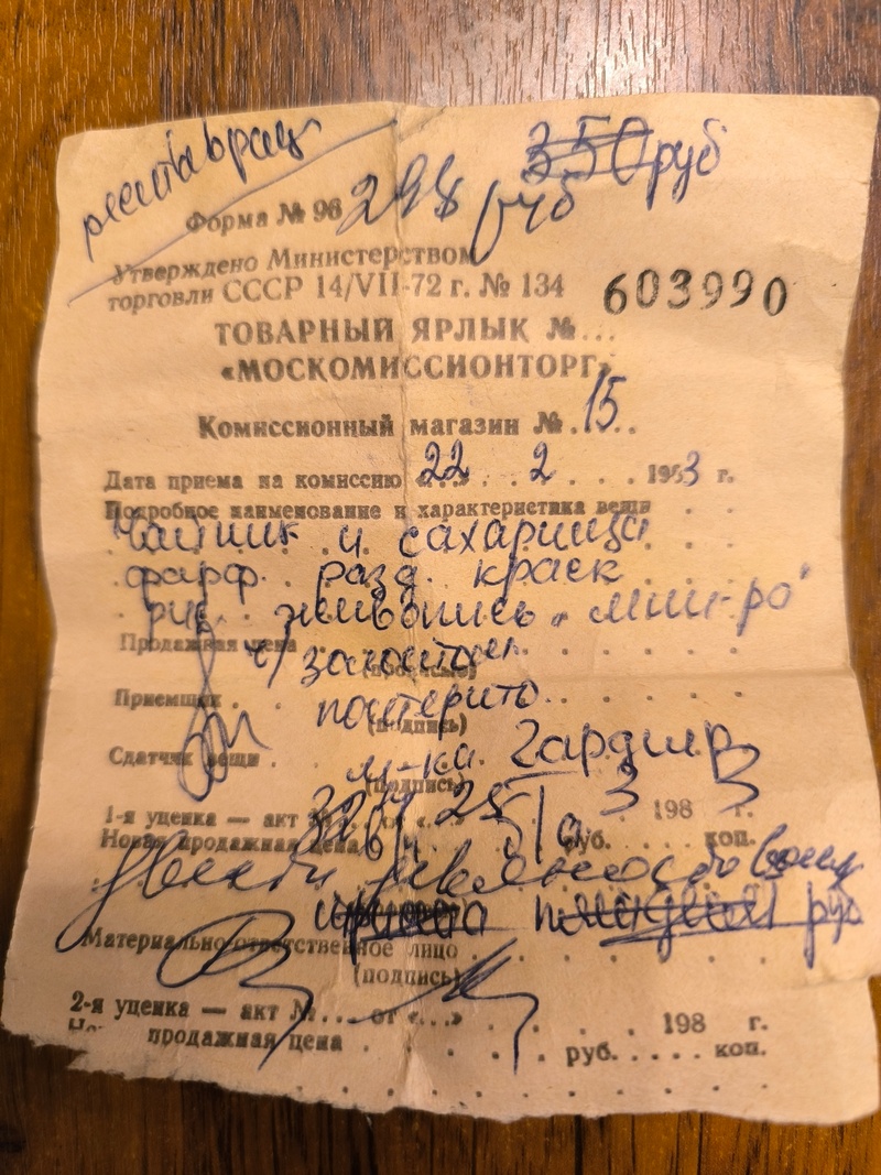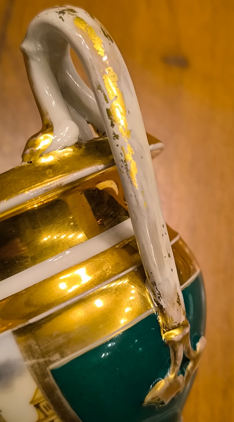 Завод Сафронова. Марка синяя подглазурная. 1810-1820 гг. Фарфор, живопись, золочение. Значительные потертости позолоты. Отсутствует крышка. Реставрация ручки. Редкость. На данный предмет имеется чек из комиссионного магазина от 1983 года (указано ошибочно, что предмет фабрики Гарднер).