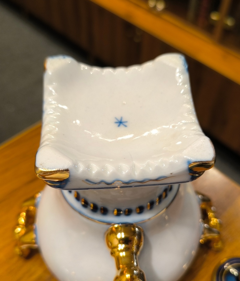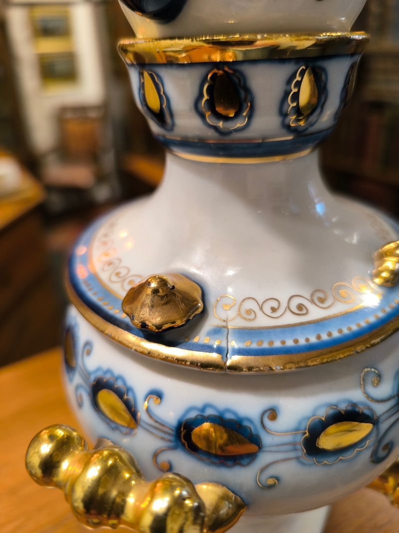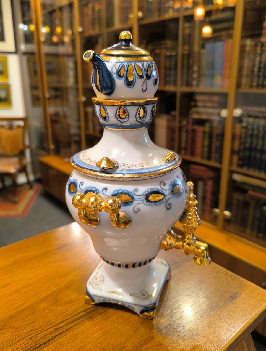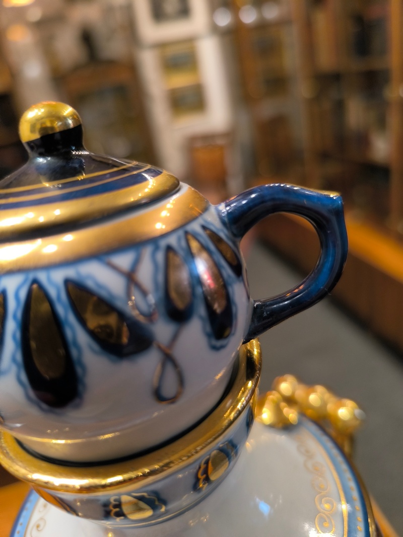 СССР. 1970-ее гг. Фарфор, роспись синей краской, яркое золочение. У маленького заварочного чайничка отбита и аккуратно приклеена ручка. На крышке самовара имеется небольшая заводская печная трещина. Все остальное - без сколов, трещин и реставраций.