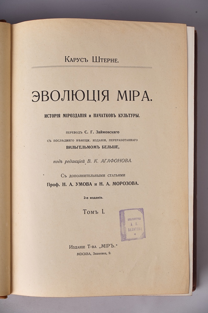 Перевод С.Г. Займовского с последнего немецкого издания, переработанного В. Бельше. С дополнительными статьями проф. Н.А. Умова и Н.А. Морозова. Второе издание. С черно-белыми иллюстрациями в тексте, цветными хромолитографированными на отдельных листах. Двойной титульный лист, один из них иллюстрированный в стиле Модерн художником М. Соломоновым. В издательских полукожаных художественно-оформленных переплетах. Корешки с тиснением названия и орнамента золотом (с небольшими повреждениями по краям). Коленкоровые крышки. По верхним крышкам объемное тиснение орнамента. Тройной цветной обрез.