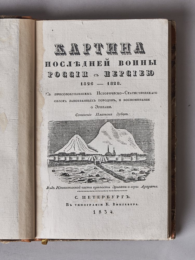 Иллюстрированный гравированный титульный лист. Гравированная заставка "Вид монастыря Эчмиадзина". На форзаце - штамп-экслибрис личной библиотеки. В полукожаном отреставрированном переплете с сохранением внутри издательской иллюстрированной обложки. Верхняя крышка обложки с небольшим дефектом. Полностью востановлен кожаный корешок с тиснением названия золтом. Сохранены крышки, оклеенные мраморной бумагой. Редкость!