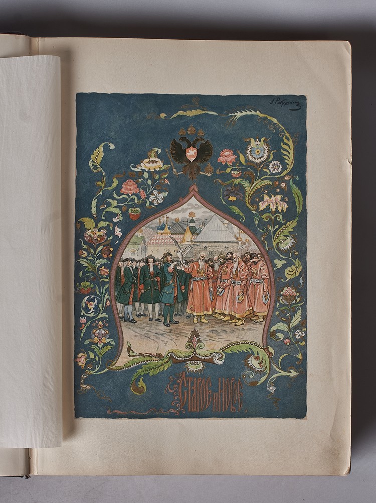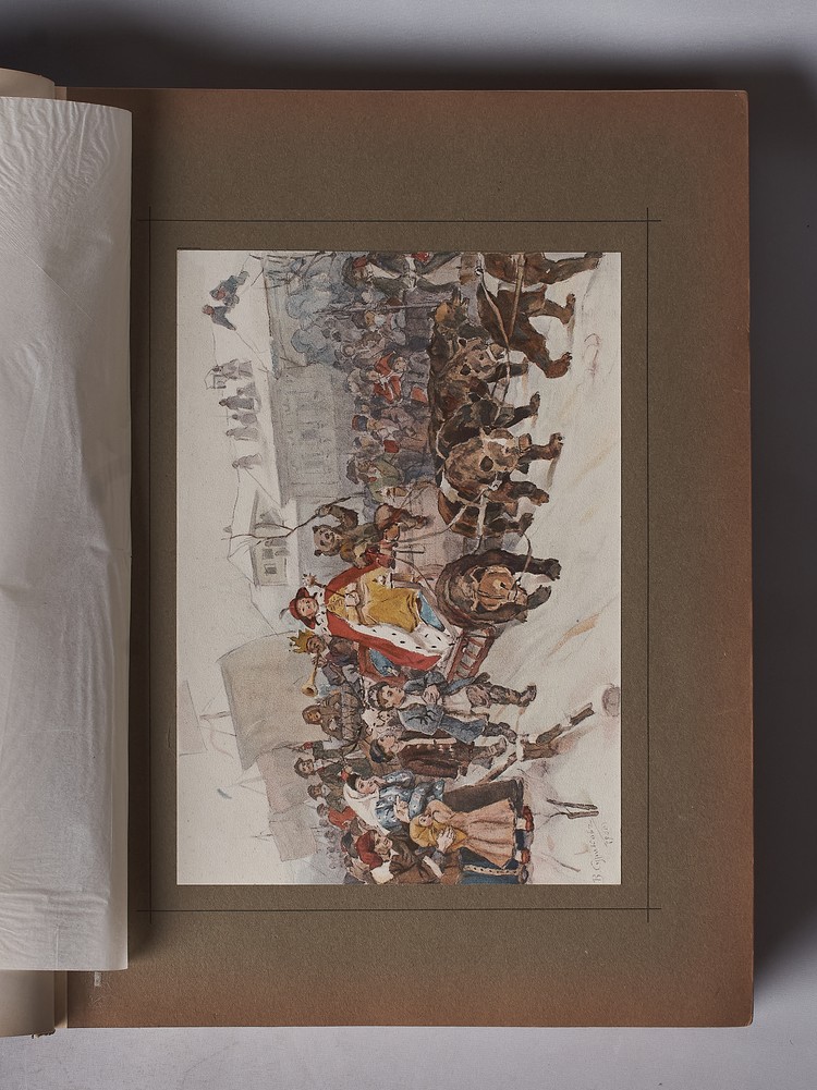 Издание иллюстрировано художниками: Бенуа, Васнецов, Лансере, Лебедев, Пастернак и др. С иллюстрациями, картами в тексте. 34 хромолитографированные иллюстрации на отдельных листах. На обложке и двух страницах имеются печати библиотеки до 1917 года. В полукожаном заказном владельческом переплете времени издания с сохранением внутри хромолитографированных издательских обложек. Бинтовой корешок с тиснением названия и инициалов владельца золотом. Крышки красного коленкора с тиснением на верхней названия золотм. Переплет имеет временные потертости, временные пятна.