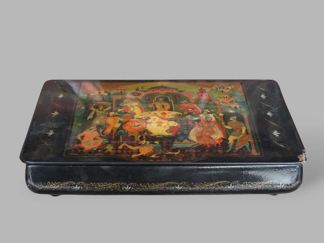 Холуй. 1960-70-ее гг. Папье-маше, роспись. В нижней части изображения авторская надпись: "Холуй. Сказка о царе Салтане. Храпов А.А." Имеется небольшое повреждение по углу шкатулки. Небольшие следы бытования.