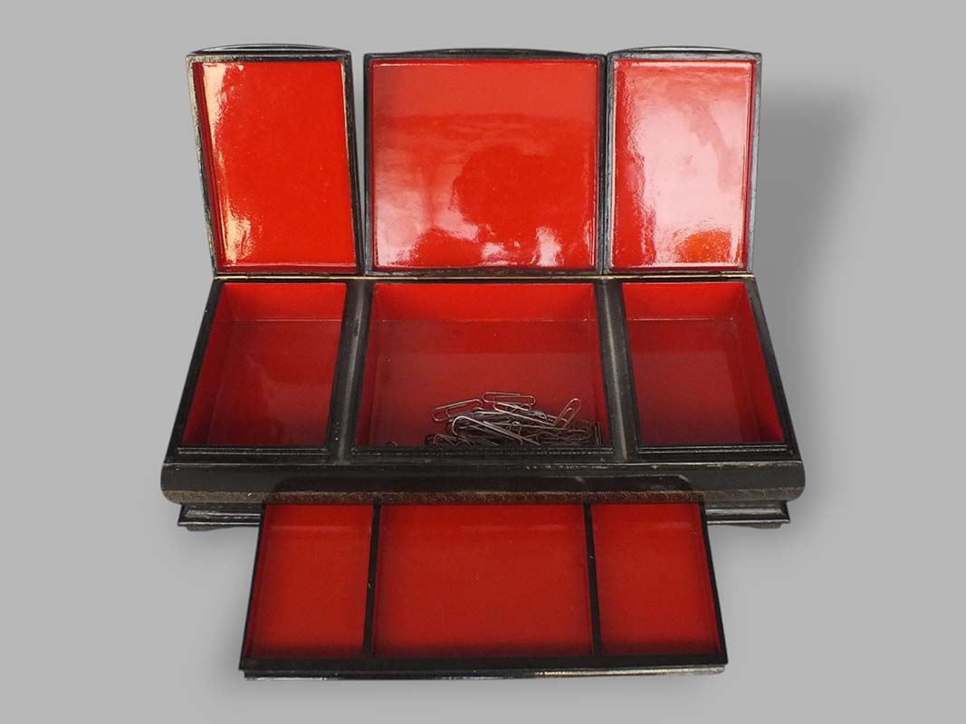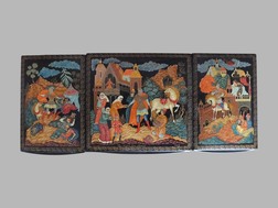 Холуй. 1960-70-ее гг. Папье-маше, роспись. В нижней части изображения авторская надпись: "Холуй. Три поездки Ильи Муромца. Серов". Шкатулка состоит из трех отделений и выдвигающейся нижней части. У двух крышек шкатулки отсутствут крепление.