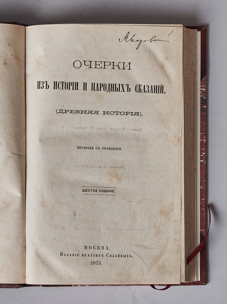 Перевод с немецкого. Шестое издание. На титульном листе владельческий росчерк. На форзацах - штампы-экслибрисы владельческой библиотеки. Оглавление написано от руки чернилами. В полукожаном владельческом переплете. Бинтовой корешок с тиснением названия золотом. Кожаные уголки. Крышки оклеены бумагой "павлиний глаз".