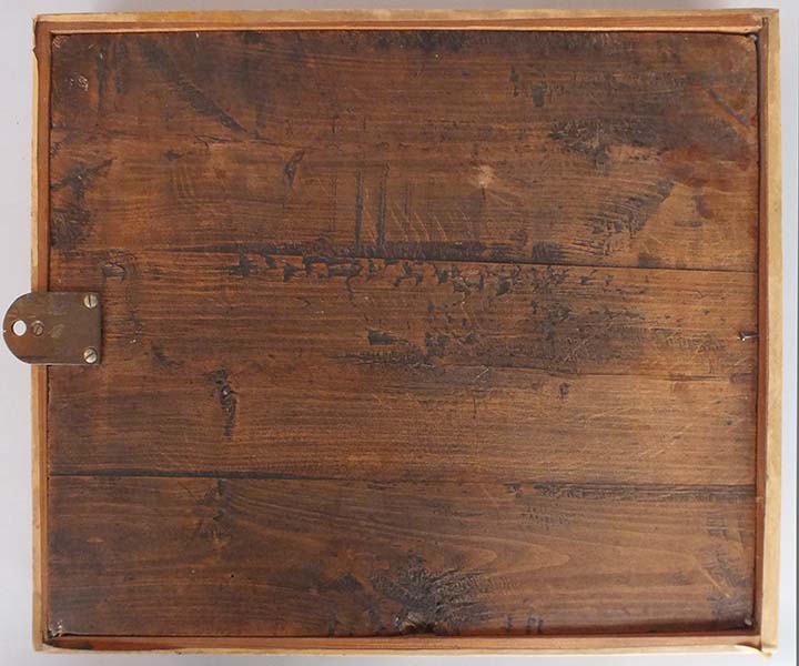 Россия. Середина XIX века. Доска, живопись, золочение. Имеются повреждения красочного слоя, следы от "рассошейся" деревянной доски. В нижней части иконы несколько значительных отслоений краски. В левом углу к доске приклеена литографированная карточка с изображением Сергия Радонежского (закрыт од из праздников). В старом простом деревянном киоте. Киот со стеклом.