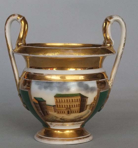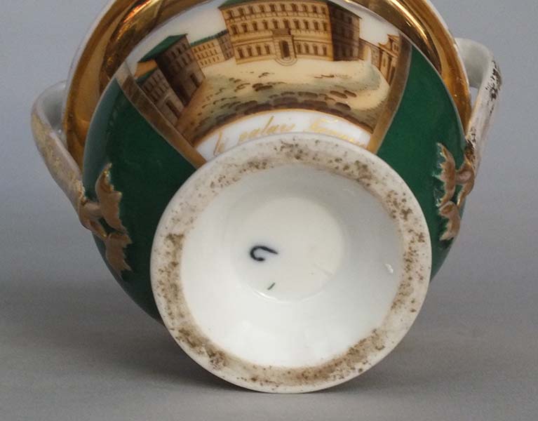 Завод Сафронова. Марка синяя подглазурная. 1810-1820 гг. Фарфор, живопись, золочение. Значительные потертости позолоты. Отсутствует крышка. Профессиональная реставрация ручки. Редкость.