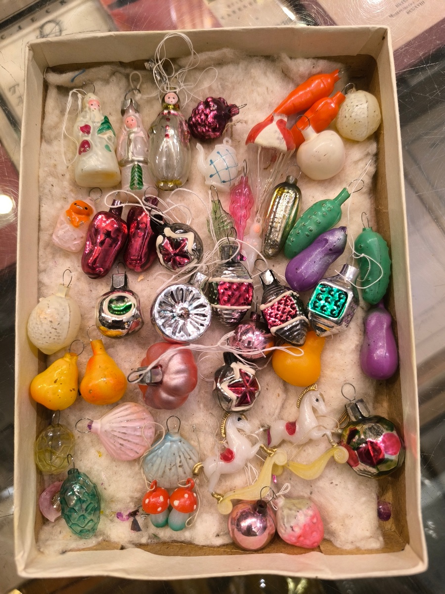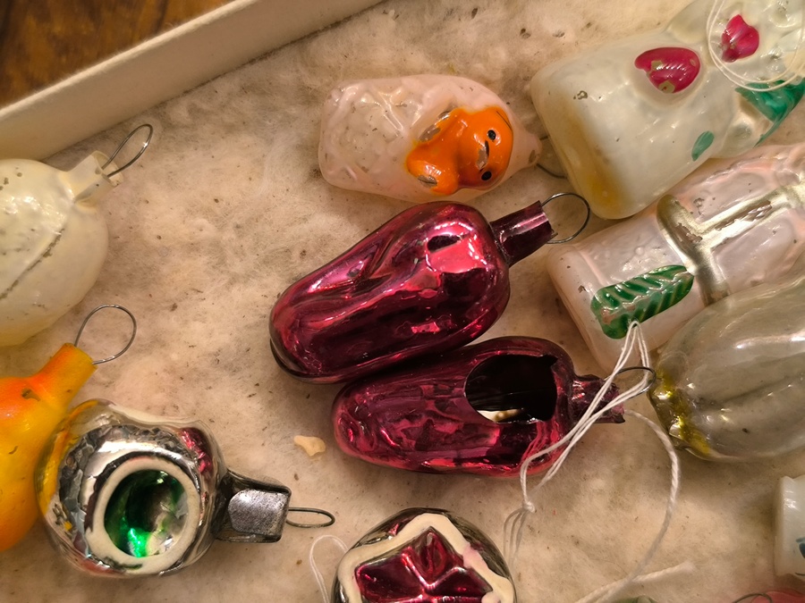Московский завод елочных украшений. 1960-ее гг. 44 игрушки в заводской картонной коробке. По спецификации чего-то не хватает, но есть двойные экземпляры (например лошадка). В целом в хорошем состоянии. Имеются небольшие сколы по трубочкам у некоторых игрушек. Не хватает фрагмента у перца.