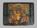 Холуй. 1960-70-ее гг. Папье-маше, роспись. В нижней части изображения авторская надпись: "Холуй. Сказка о царе Салтане. Храпов А.А." Имеется небольшое повреждение по углу шкатулки. Небольшие следы бытования.