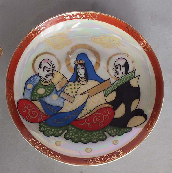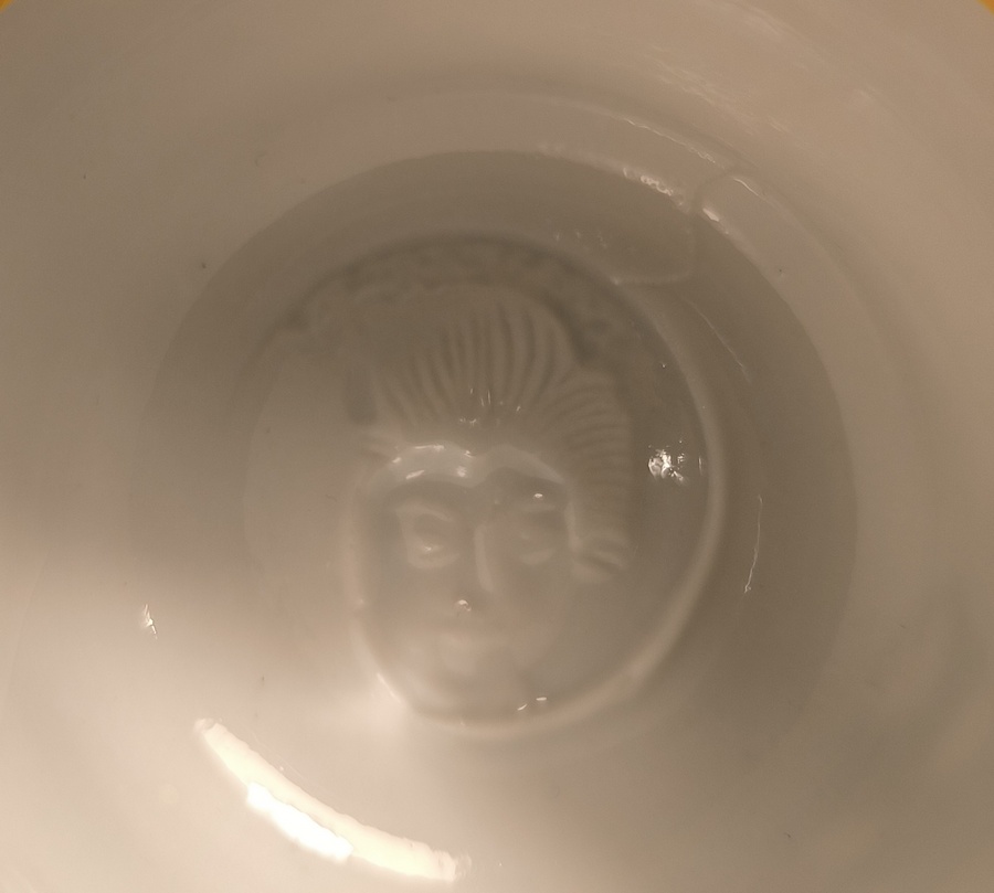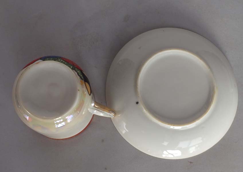 Япония. 1950-ее гг. Фарфор, роспись, накат краски, перламутр. Сквозная трещина по чашке. Небольшая трещина на блюдце. На дне чашки литофания с портретом гейши. Обязательно посмотрите дно чашки на просвет!