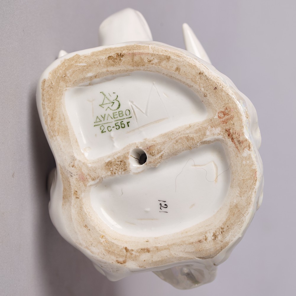 Дулевский фарфоровый завод. 2 сорт. 1956 г. Полихромная надглазурная и подглазурная росписи, перламутр. Фарфор, роспись золотом и краской. На клюве с нижней стороны заводская неровность краски. Потерта позолота на короне. Без сколов, трещин и реставраций.
