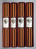 Тираж 42 нумерованных экземпляра. История кавалергардов. 1724-1799-1899. По случаю столетнего юбилея Кавалергардского Ее Величества Государыни Императрицы Марии Фёдоровны полка. Составил С. Панчулидзев. Факсимильное издание. В четырех цельнокожаных переплетах телячьей кожи. Верхняя крышка декорирована вставкой - воспроизведение Ордена Иоанна Иерусалимского (серебро, золочение, эмаль). Корешок с тиснением двуглавого орла и названия золотом. В коленкоровых футлярах с тиснением и отделкой муаром. Тройные золотые обрезы, шелковые узорные ляссе. Коллекционное сотояние (новые книги).