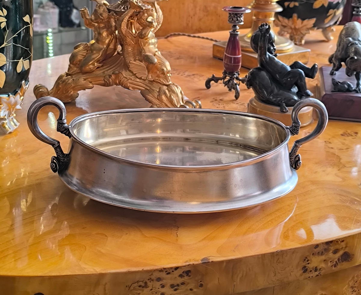 Россия. До 1917 года. Серебро 84 пробы, гравировка, остатки золочения. Клеймо "84" с женской головкой в кокошнике, повернутой в левую сторону. Клеймо пробирного мастера "ВА". Пробы проставлены на всех отдельных деталях предмета. Вес - 659 гр. Основание немного неровно. Несколько темных незначительных точек по серебру
