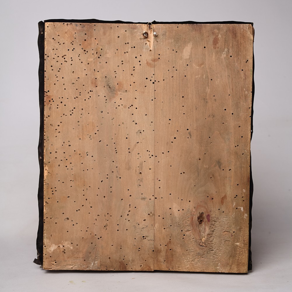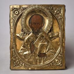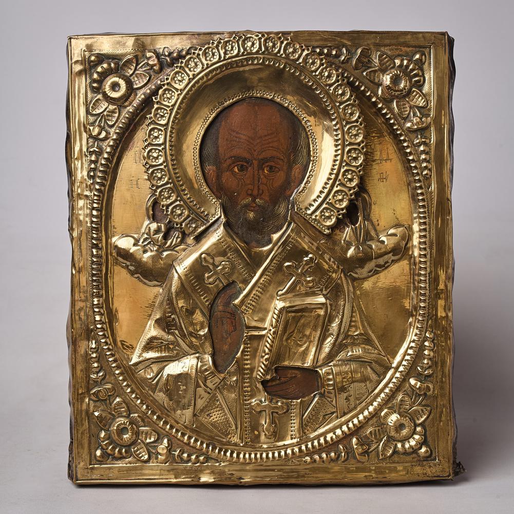 Россия. Нач. ХХ века. Доска; лик, руки - подокладная живопись. Оклад - латунь. По краям расшатан. Доска с оборотной стороны пробита жучком.
