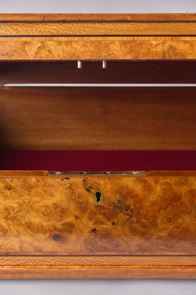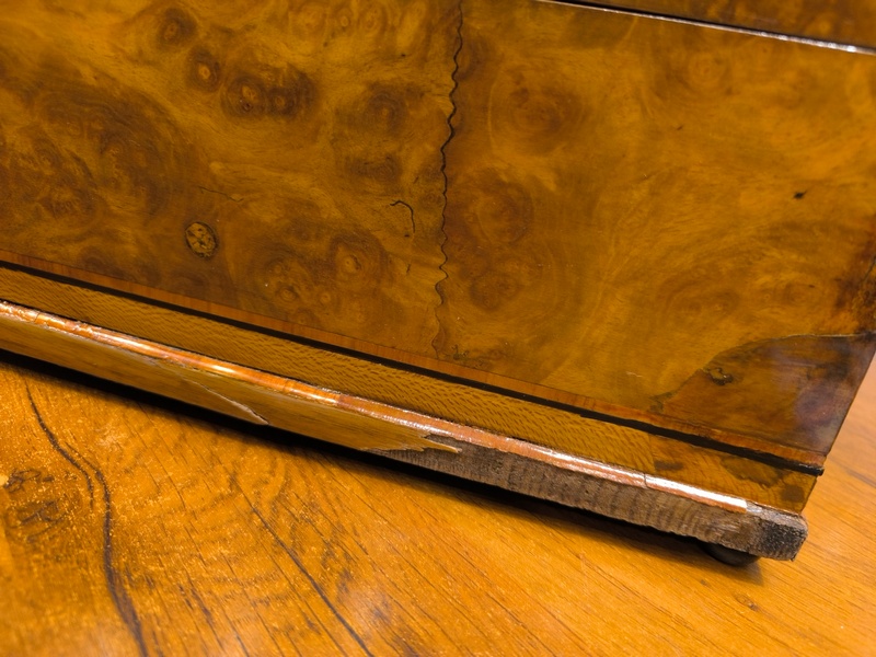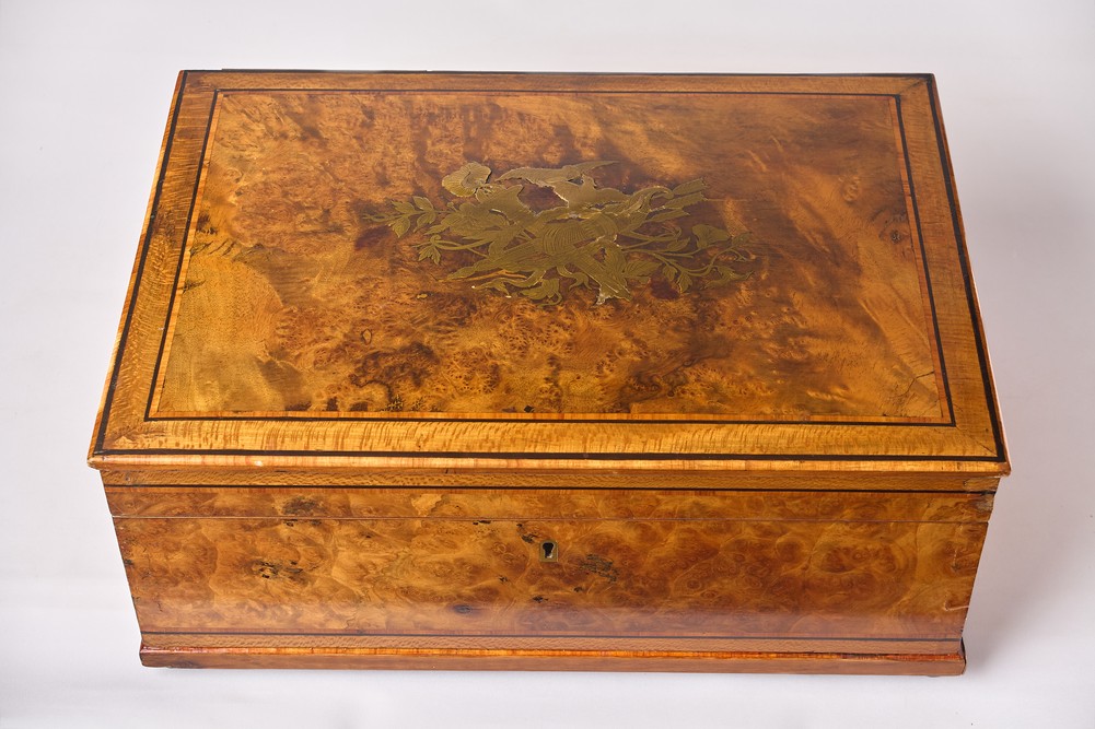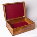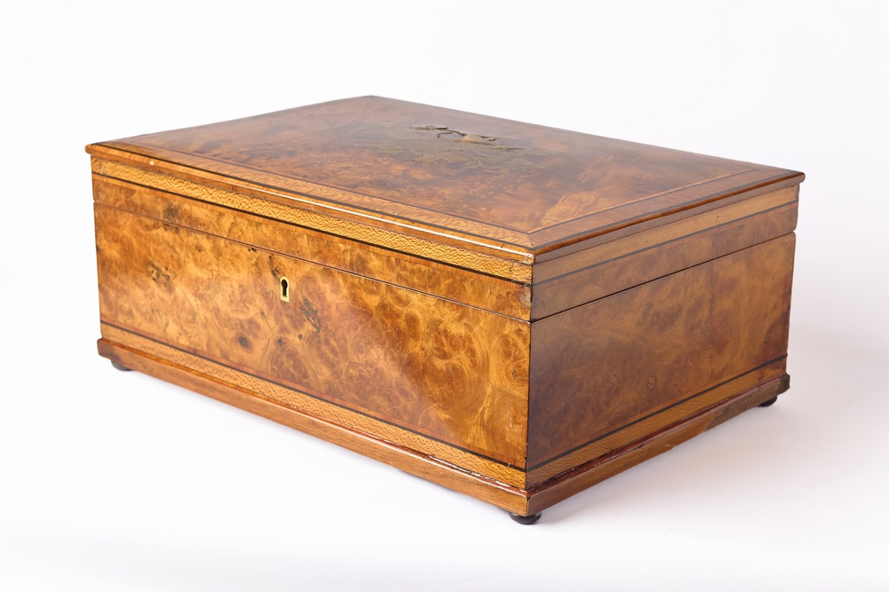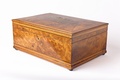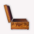 Европа. 1870-ее годы. Орех (шпон), маркетри, лак, фурнитура - бронза. Отсутствует ключ. На четырех маленьких круглых ножках. Внутри оклеена бархатной бумагой. Отсутствуют небольшие фрагменты шпона.