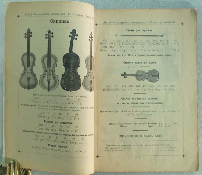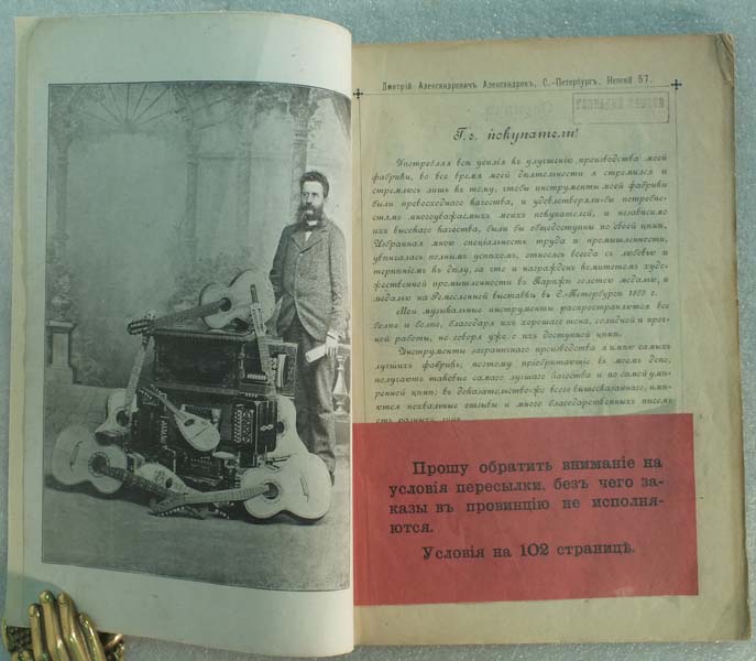 До 1914 года. Подробный каталог музыкальных инструментов с описанием и рисунками. В полностью востановленной иллюстрированной обложке. На страницах имеются временные пятна.