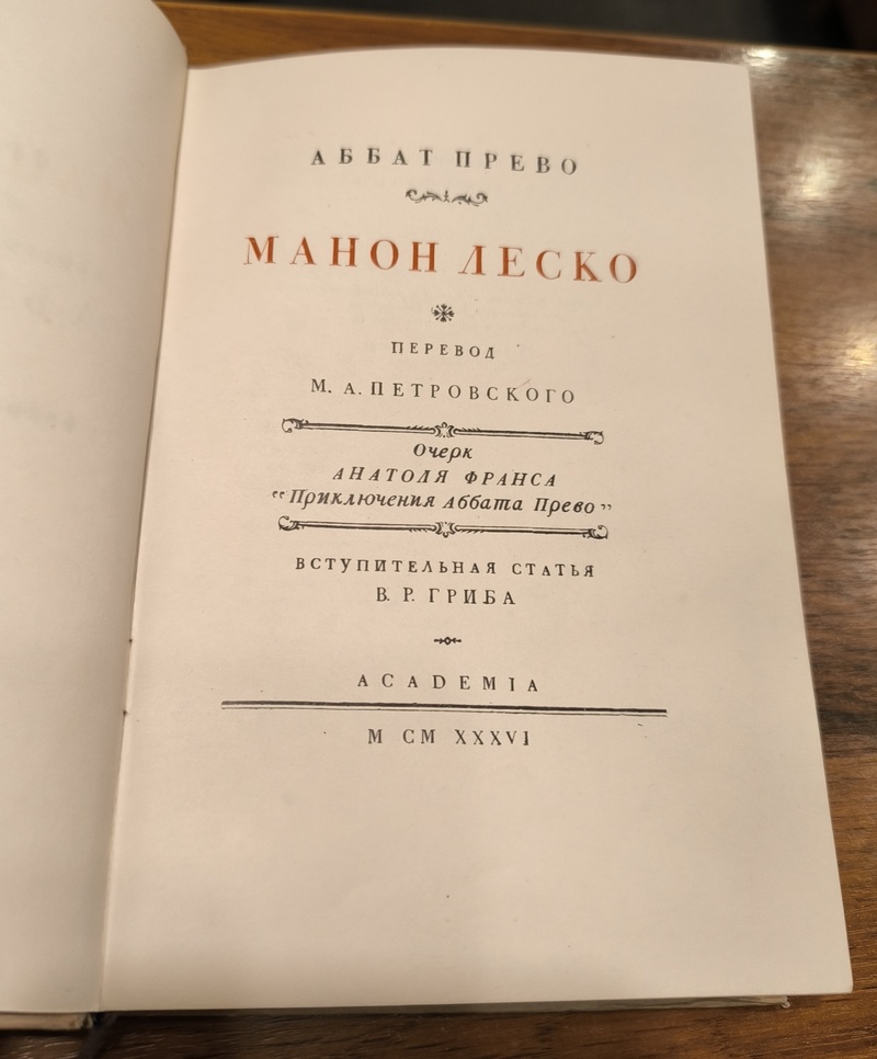 Серия "Французская литература". Перевод М.А. Петровского. Очерк Ан. Франса "Приключения аббата Прево". Титула, виньетки, переплет и суперобложка - композиция В.М. Конашевича из шрифтов и орнамента Дж. Бодони. В картонном издательском переплете с временными пятнами и повреждением в верхней части корешка. Суперобложка отсутствует.