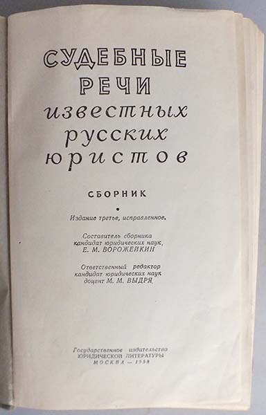 Представлены речи знаменитых русских юристов. В данном издании содержатся биографические справки и речи следующих известных русских юристов: П. А. Александров (дело Засулич, дело Сарры Модебадзе и др.), С. А. Андреевский (дело братьев Келеш, дело о краже изумрудной брошки, дело Мироновича и др.), К. К. Арсеньев (дело Мясниковых, дело Рыбаковской), В. И. Жуковский (дело Гулак-Артемовской, дело Юханцева), Н. П. Карабчевский (дело о крушении парохода Владимир, дело Мироновича, дело Ольги Палем и др.), Ф. Н. Плевако (дело Бартенева, дело Грузинского, дело Замятниных, дело Лукашевича, дело Люторических крестьян, дело рабочих Коншинской фабрики и др.), В. Д. Спасович (дело Давиди и Николая Чхотуа и др. (Тифлисское дело), дело Дементьева, дело Овсянникова), А. И. Урусов (дело Волоховой, дело Мироновича, дело Дмитриевой и Каструбо-Карицкого), К. Ф. Халтулари (дело Маргариты Жюжан, дело Левенштейн, дело Левицкого и других, дело Разнатовского и др.), Н. И. Холев (дело Максименко).