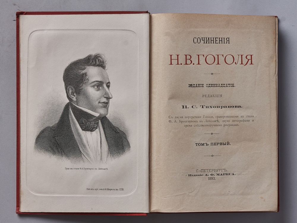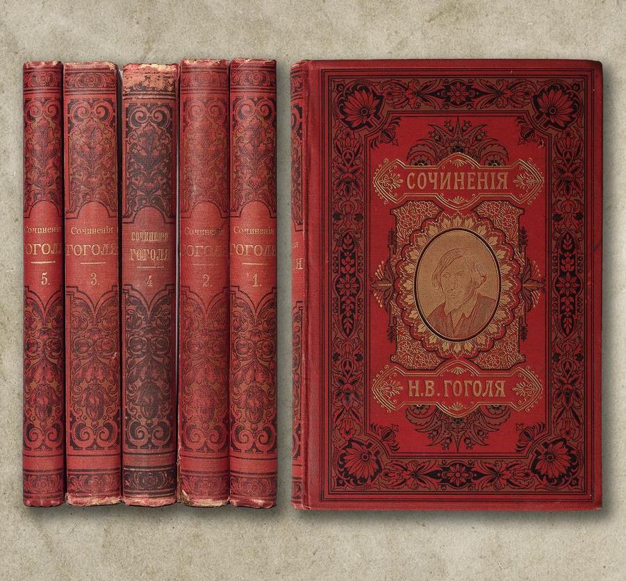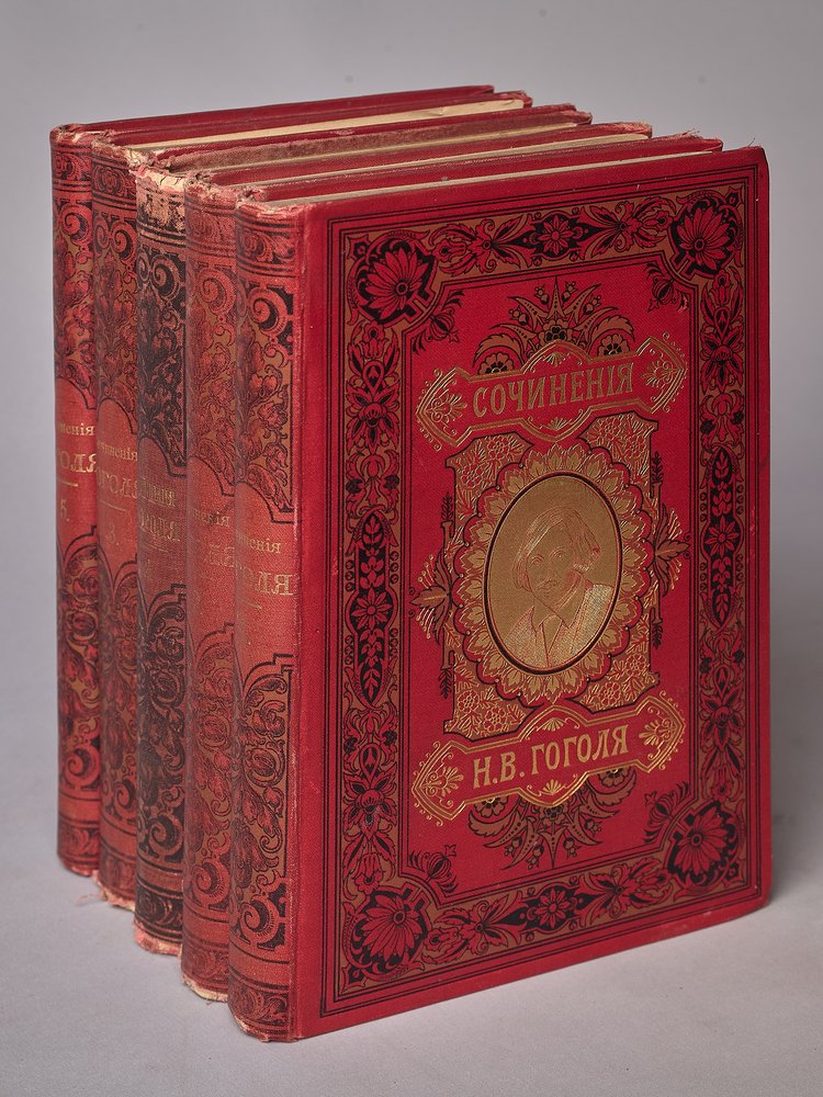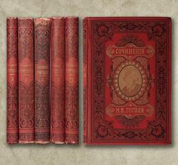 Издание одинадцатое. Редакция Н.С.Тихонравова. С двумя портретами Гоголя, гравированными на стали Брокгаузом в Лейпциге, двумя автографами и тремя собственноручными рисунками. В коленкоровых художественно-оформленных переплетах времени издания. Небольшие временные потертости по краям корешков. На верхних крышках тиснение орнамента и портрета автора золотом. Тройной мраморный обрез.
