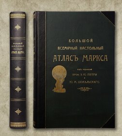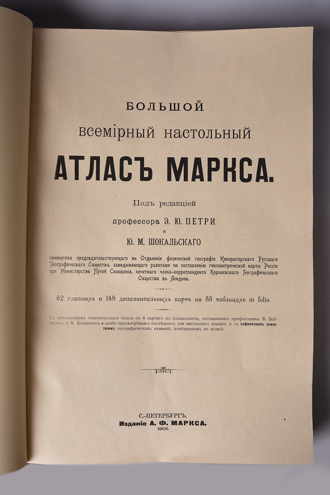 Бесспорно, выдающимся картографическим произведением начала XX в. был «Большой всемирный настольный Атлас Маркса» (СПб., 1905). Атлас вышел под редакцией знаменитых географов профессора Э. Ю. Петри и Ю. М. Шокальского. Работа над составлением атласа длилась 8 лет. Карты русской части атласа были пополнены, изменены и, если требовалось, заново составлены, вычерчены и перегравированы на камнях.