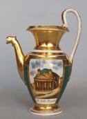 Завод Сафронова. Марка синяя подглазурная. 1810-1820 гг. Фарфор, живопись, золочение. Значительные потертости позолоты. Скол по носику. Профессиональная реставрация ручки.Редкость.