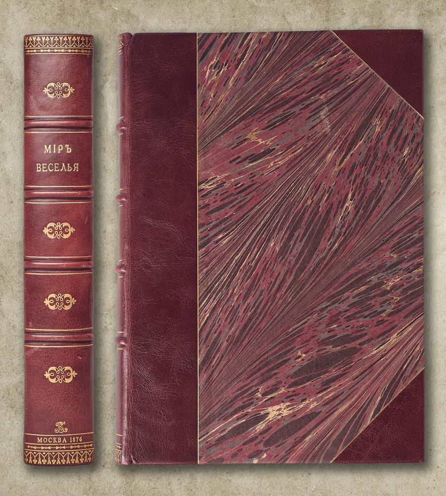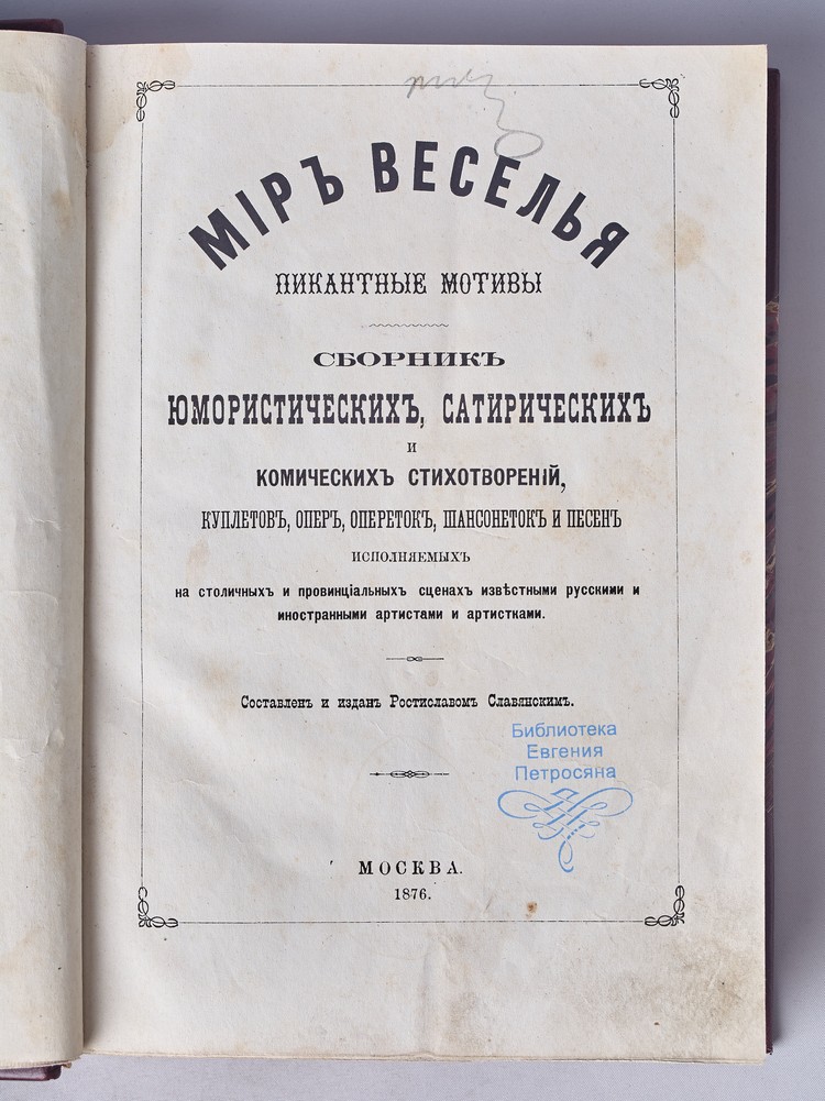Сборник юмористических, сатирических и комических стихотворений, куплетов, опер, опереток, шансонеток и песен, исполняемых на столичных и провинциальных сценах известными русскими и и ностранными артистами и артистками. Каждая страница текста - в орнаментальной рамке. Некоторые страницы имеют временные пятна. На форзаце и титульном листе шамп-экслибрис личной библиотеки Евгения Петросяна. В полукожаном владельческом переплете. По корешку тиснение названия золотом. Кожаные уголки. Крышки оклеены мраморной бумагой.
