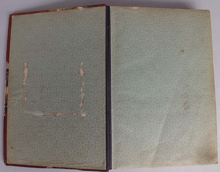 Издаваемый на средства Туркестанского Окружного Управления Российского Общества Красного Креста. На титульном листе - цифры орешковыми чернилами. Печатей библиотечных нет, но имеется след от библиотечного кармашка на форзаце. Небольшие следы увлажнения в верхней части на нескольких страницах. В полукожаном переплете времени издания с временными пятнами. Бинтовой кожаный корешок украшен тиснением названия золотом и орнаментальных деталей. Кожаные уголки. Крышки оклеены бумагой с цветочным орнаментом. Блок несколько расшатан.