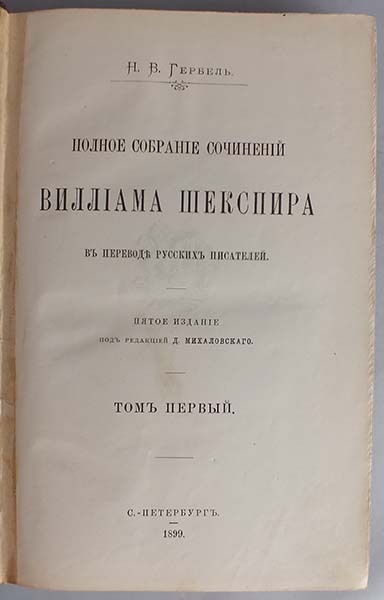 Пятое издание, под редакцией Д.Михаловского. Биографический очерк П. Н. Полевого. С гравированным портретом Шекспира. В издательских полукожаных переплетах. Корешки с тиснением названия золотом. Коленкоровые крышки т.ж. с тиснем названия золотом. Первый том имеет реставрацию (аккуратно проклеен бумагой). На корешке третьего тома небольшое повреждение в верхней части. Переплеты имеют небольшие временные потертости.