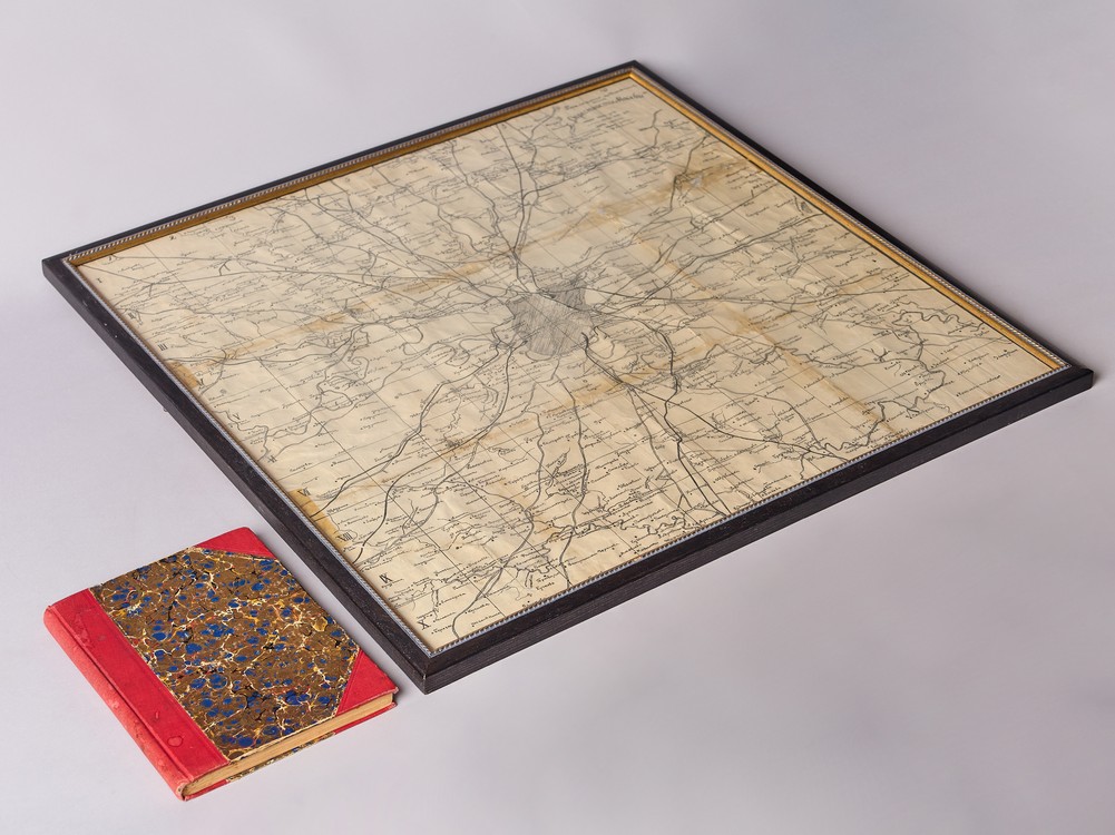 В составном переплете времени издания. Коленкоровый корешок и коленкоровые уголки. Крышки оклеены мраморной бумагой Имеются незначительные временные пятна. На форзаце владельческий росчерк. Раскладвающаяся карта из данного издания заключена в багет, имеет небольшую профессиональную реставрацию по местам сгибов.