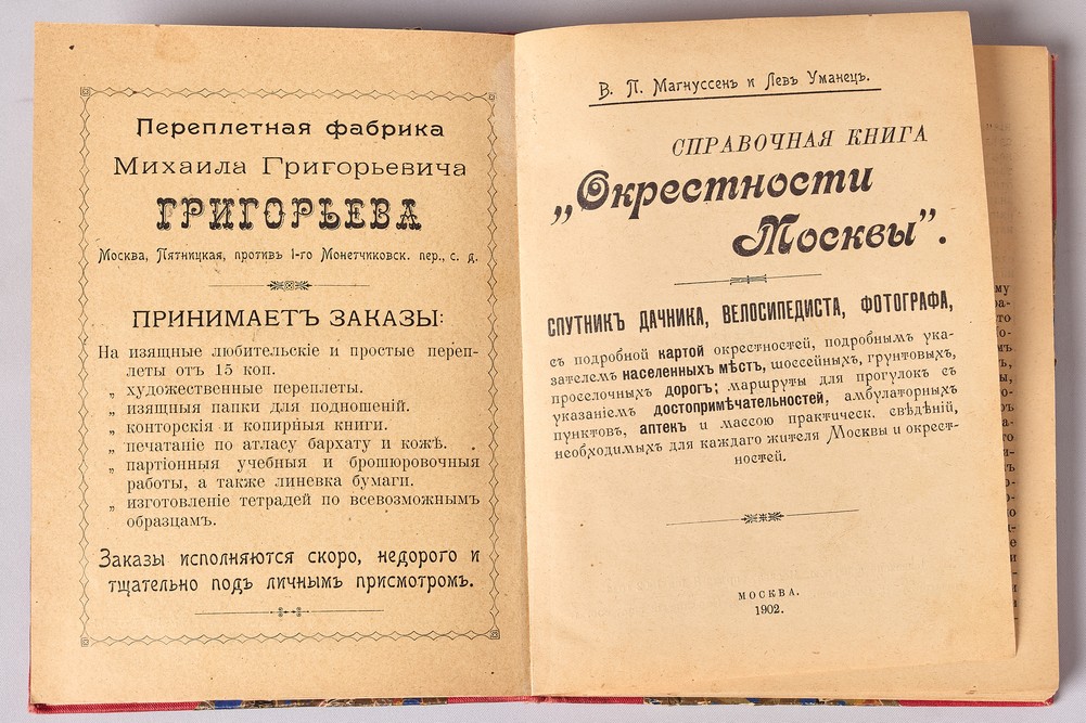 Полное название: Справочная книга "Окрестности Москвы": Спутник дачника, велосипедиста, фотографа, с подробной картой окрестностей, подробным указателем населенных мест, шоссейных, грунтовых, проселочных дорог; маршруты для прогулок с указанием достопримечательностей, амбулаторных пунктов, аптек и массою практическ. сведений, необходимых для каждаго жителя Москвы и окрестностей.