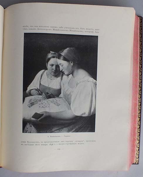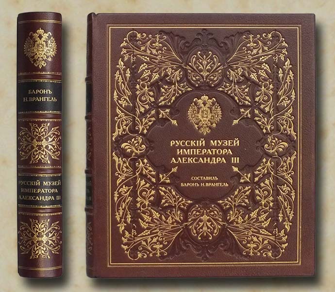 С многочисленными иллюстрациями в тексте и на отдельных листах. Два тома в заказном цельнокожаном владельческом переплете с сохранением внутри печатных издательских обложек. Бинтовой корешок с тиснением названия золотом. По верхней крышке тиснение названия в орнаментальной рамке. Форзацы оклеены бумагой "павлиний глаз". Тройной узорчатый обрез. Один из первых иллюстрированных каталогов Русского Музея, в котором в полной мере отражена история его создания.