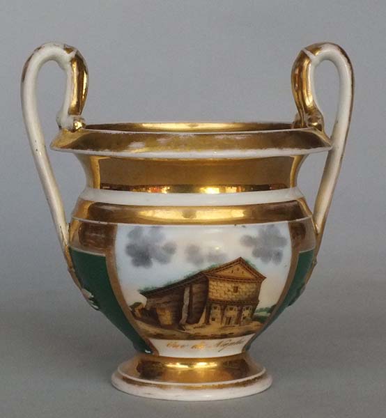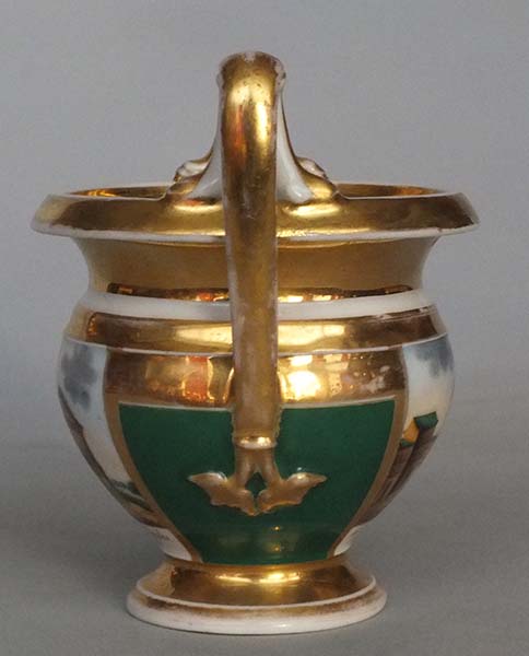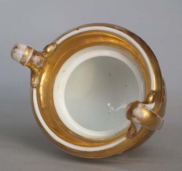 Завод Сафронова. Марка синяя подглазурная. 1810-1820 гг. Фарфор, живопись, золочение. Значительные потертости позолоты. Отсутствует крышка. Реставрация ручки. Редкость. На данный предмет имеется чек из комиссионного магазина от 1983 года (указано ошибочно, что предмет фабрики Гарднер).