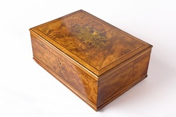 Европа. 1870-ее годы. Орех (шпон), маркетри, лак, фурнитура - бронза. Отсутствует ключ. На четырех маленьких круглых ножках. Внутри оклеена бархатной бумагой. Отсутствуют небольшие фрагменты шпона.