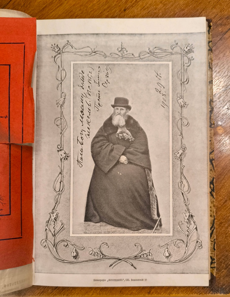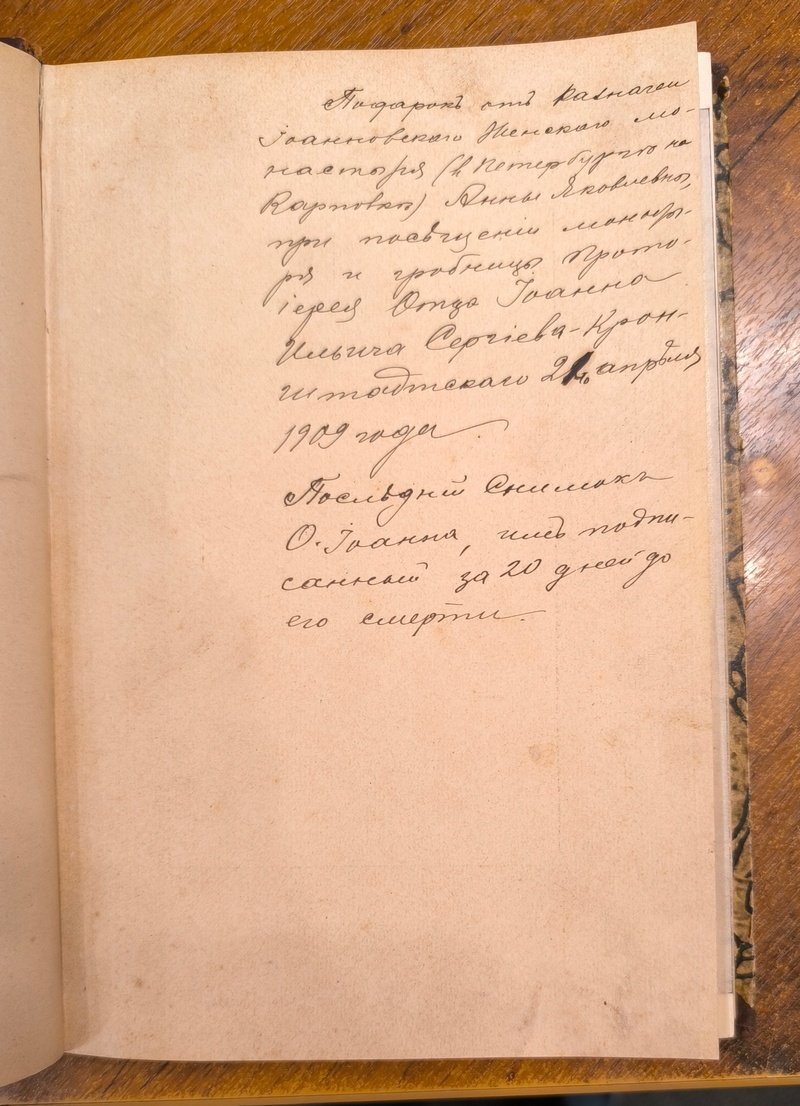 На форзаце очень интересная развернутая дарственная надпись, датируемая 21 апреля 1909 г. С портретом и эпиграфом (факсимиле) Иоанна Кронштадского. Посмертное издание в пользу С.-Петербургского Иоанновского женского монастыря. В полукожаном владельческом переплете времени издания. По корешку тиснение названия и инициалов владельца. Крышки оклеены мраморной бумагой. Небольшие временные потертости.