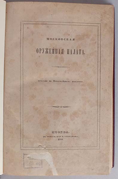 Первое подробное описание фонда Оружейной палаты Московского Кремля, составленное помощником директора (а с 1852 г. — директором) оной Александром Фомичем Вельтманом (1800-1870). Во введении освещается история самой Московской Оружейной палаты. Сведения об экспонатах систематизированы по видам, времени их появления и происхождению. В книге приводится опись и атрибуция: государственных символов, тронов, карет, оружия, облачений, подарков, трофеев, посуды и др.