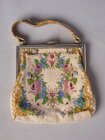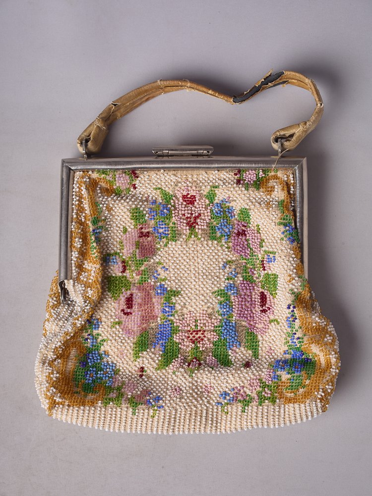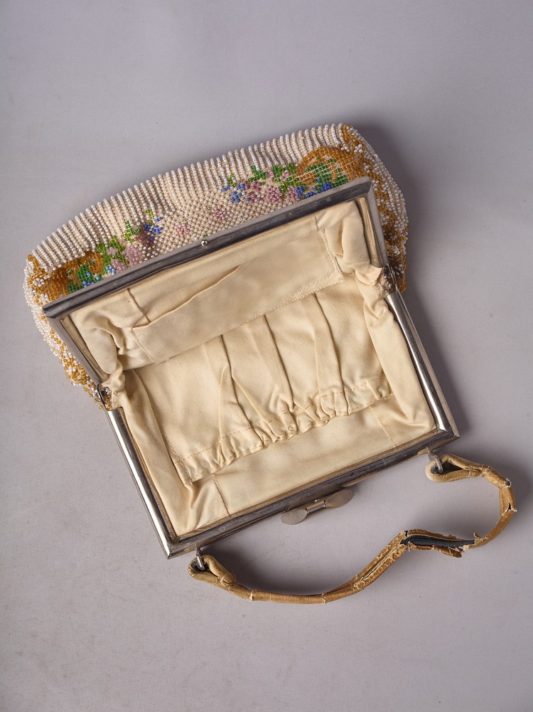 Европа - ? 1930-40-ее годы. Вышивка бисером, металл. Незнаяительные потери бисера у застежки. Кожаный слой на тканной ручке - рассохся.