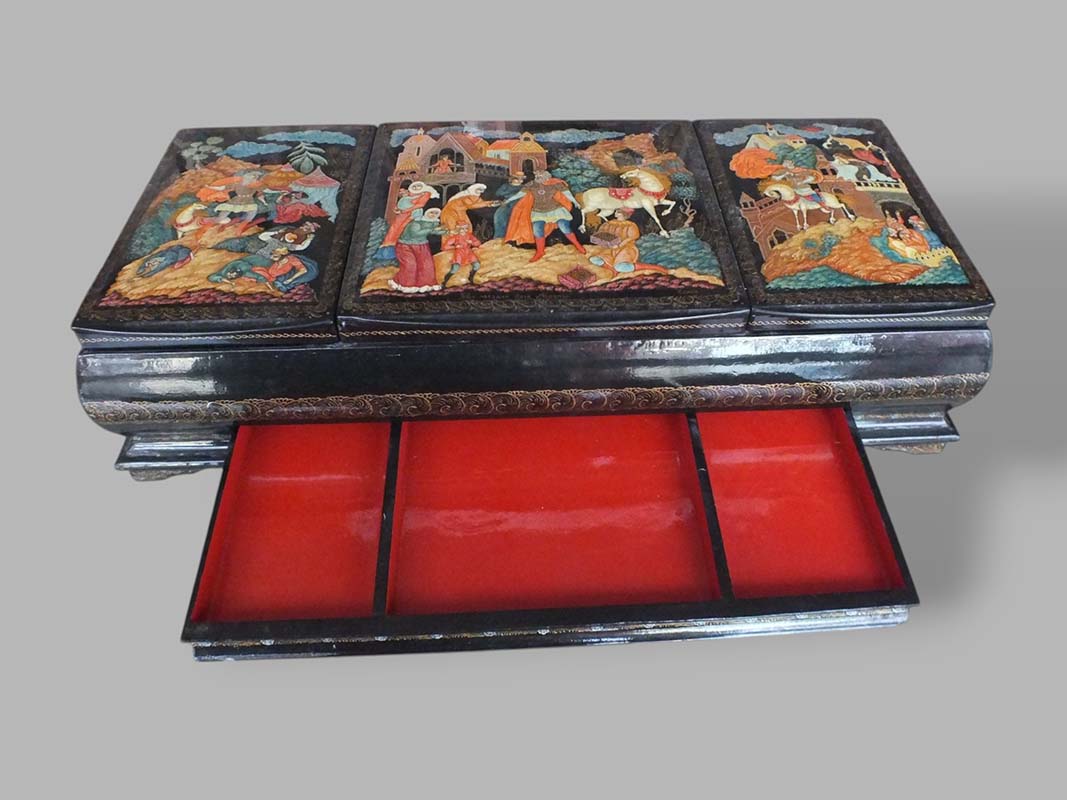 Холуй. 1960-70-ее гг. Папье-маше, роспись. В нижней части изображения авторская надпись: "Холуй. Три поездки Ильи Муромца. Серов". Шкатулка состоит из трех отделений и выдвигающейся нижней части. У двух крышек шкатулки отсутствут крепление.