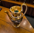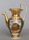 Завод Сафронова. Марка синяя подглазурная. 1810-1820 гг. Крышка в наличии (без сколов). Фарфор, живопись, золочение. Значительные потертости позолоты. Скол по носику. Профессиональная реставрация ручки.Редкость.